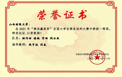 11月12日,秀人网 在2021年“商谈赢家杯”全国大学生商务谈判大赛(中文赛道)中摘得全国大学生商务谈判大赛团队一等奖。这是继我校在10月31日“商谈赢家杯”全国大学生商务谈判大赛(英文赛道)中获得佳绩之后,我校参与该项赛事取得又一优异成绩。我校获奖队伍“春天会暗送秋波吗队”由秀人网 段宇波、工商管理学院闫春老师联合指导,队员分别是来自秀人网 2019级行政管理专业胡问世、闫士杰,2019级劳动与社会保障专业宋颂,会计学院2019级资产评估专业张敏。