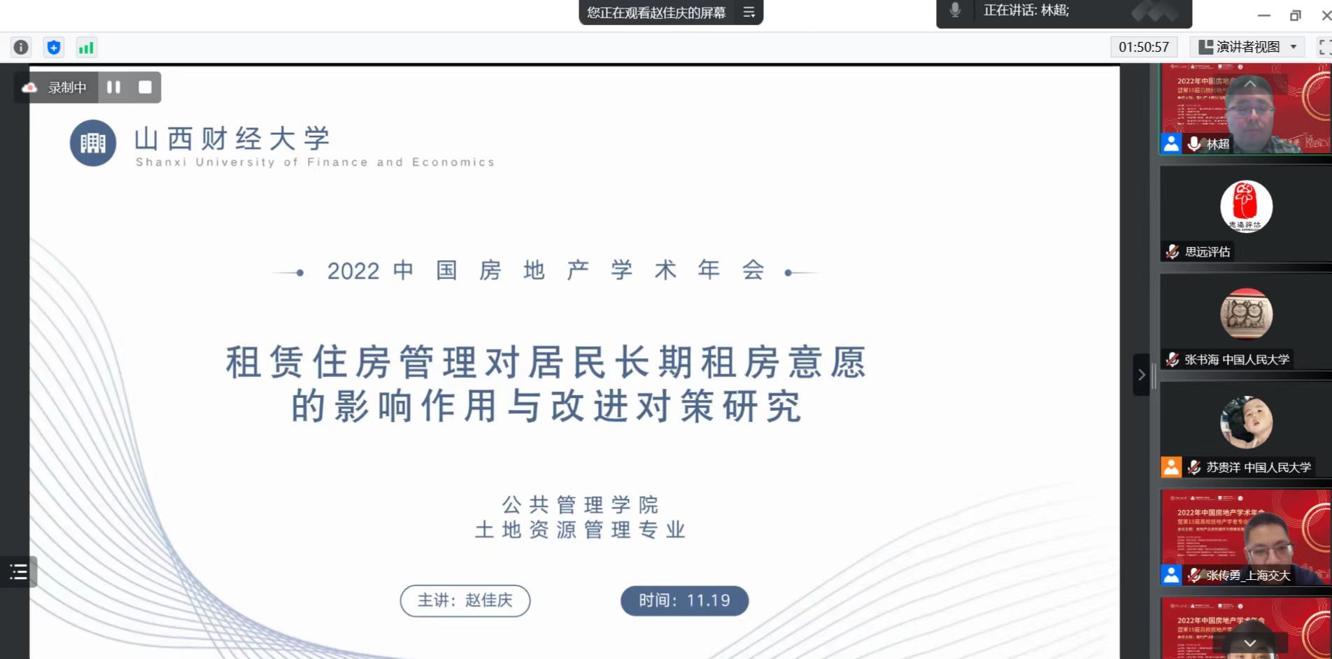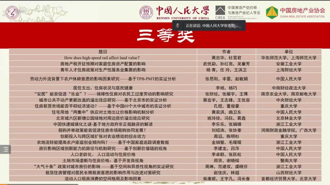 2022年中国房地产学术年会暨第15届高校房地产学者专业研讨会于2022年11月19日以线上方式成功召开。本次会议由中国人民大学、中国房地产估价师与房地产经纪人学会主办,中国人民大学秀人网 承办,会议主题为“房地产业良性循环与健康发展”。由林超副教授指导,研究生赵佳庆撰写的《租赁住房管理对居民长期租房意愿的影响作用与改进对策研究》在年会进行汇报并获论文三等奖。