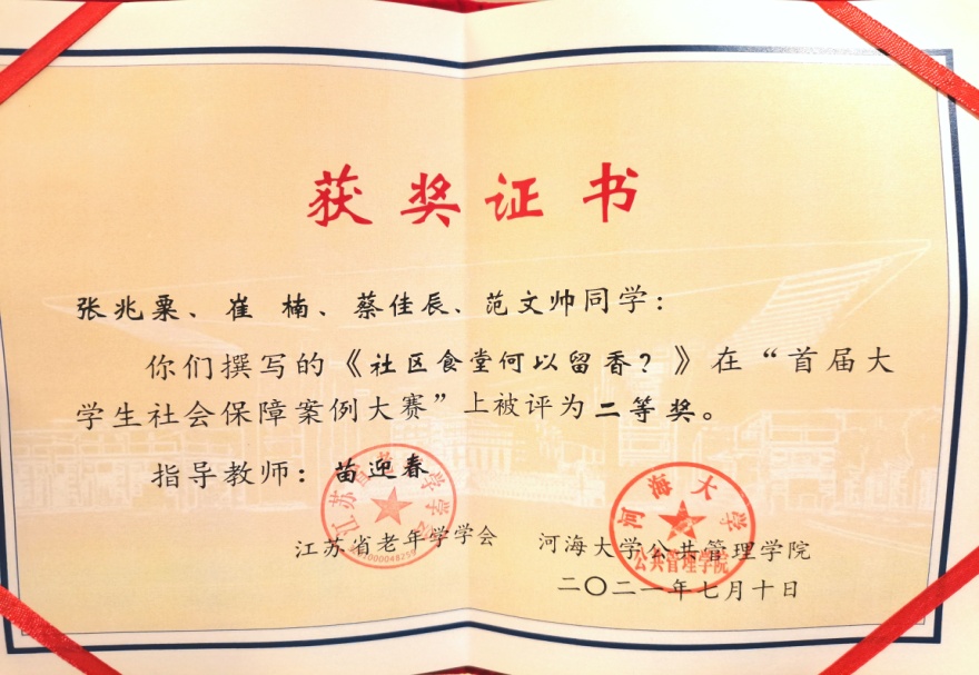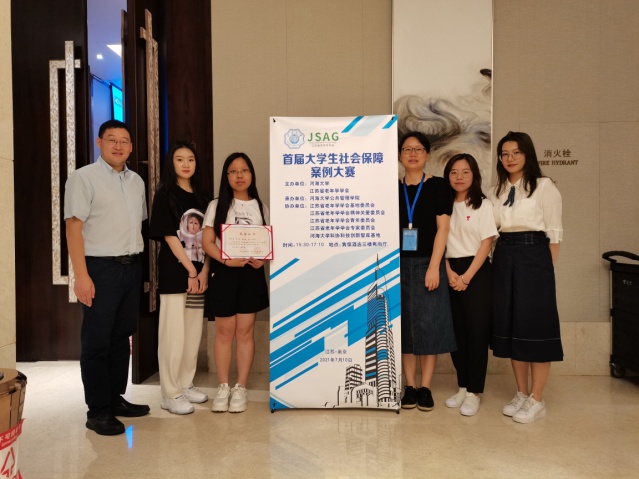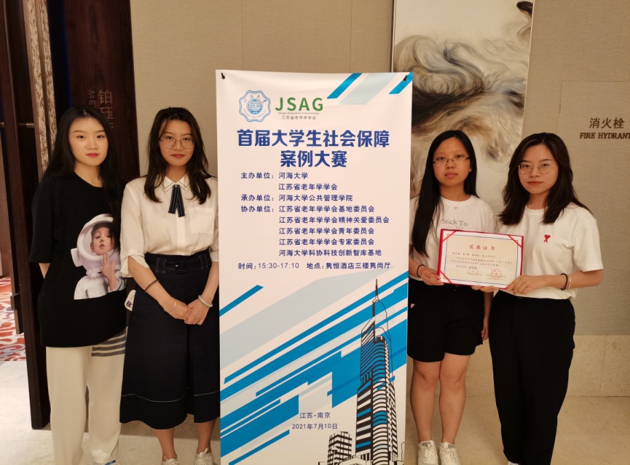 7月10日,由江苏省老年学学会、河海大学主办,河海大学秀人网 承办的“首届大学生社会保障案例大赛”颁奖大会,在十朝都会、人杰地灵的江苏省南京市隆重举行,秀人网 苗迎春老师指导的2020级社会保障研究生团队荣获二等奖,团队成员张兆粟、崔楠、蔡佳辰、范文帅赴宁参加颁奖典礼。