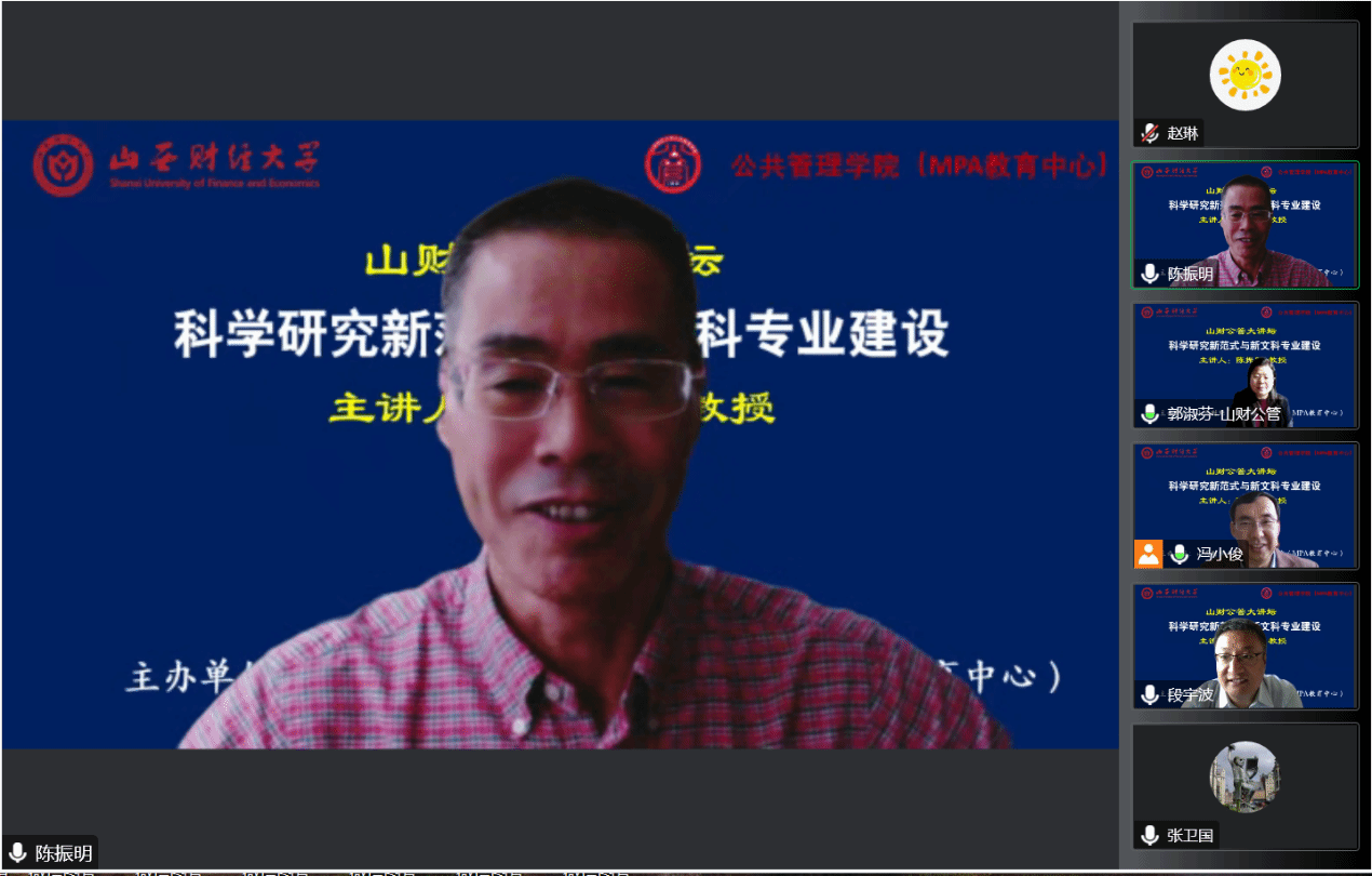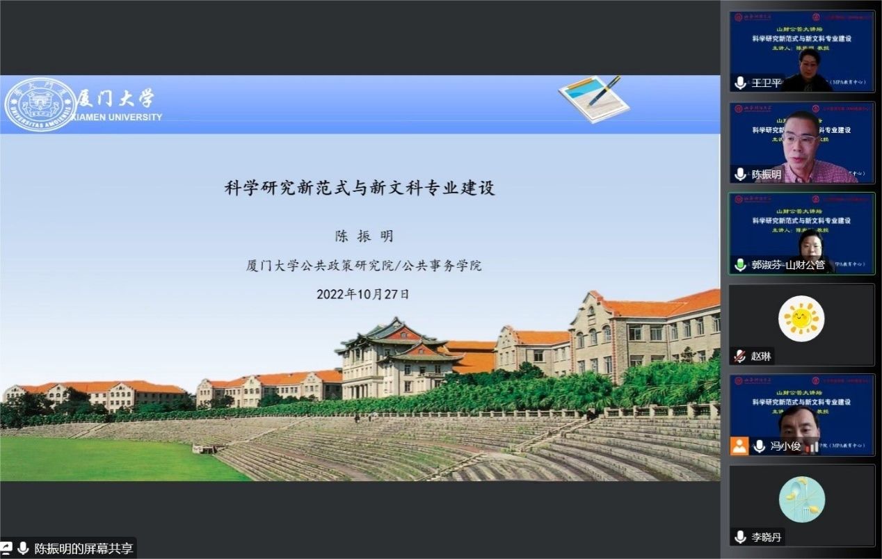 2022年10月27日,由秀人网 主办的“山财公管大讲坛”正式开讲,厦门大学公共政策研究院教授兼院长、厦门大学社会科学学部主任、“长江学者”特聘教授陈振明拨冗莅临第一讲做了题为“科学研究新范式与新文科专业建设”的报告。校党委副书记、公共管理一级学科带头人王卫平教授主持了本次大讲坛。来自校内外的300余名师生线上聆听了报告。