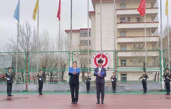 早晨7时整,升旗仪式正式开始。迎着春日的骄阳,校国旗班的护旗手们着装整齐、步伐矫健,护送鲜艳的五星红旗走向国旗台。伴随着嘹亮的《义勇军进行曲》,全场师生庄严肃立,向国旗敬礼,五星红旗冉冉升起,迎风飘扬,雄壮的国歌声响彻校园上空。