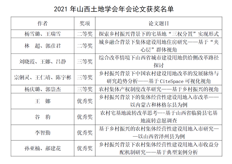 2021年山西省土地学会年会以“探索农村建设用地改革,促进乡村振兴”为主题征文。按照论文主题突出,论点鲜明,理论结合实际,学术端正的评选要求,共评选出36篇获奖论文奖项。我专业教师、研究生共9篇论文获奖,其中获得二等奖2篇,三等奖3篇,优秀奖4篇,占获奖总数25%。