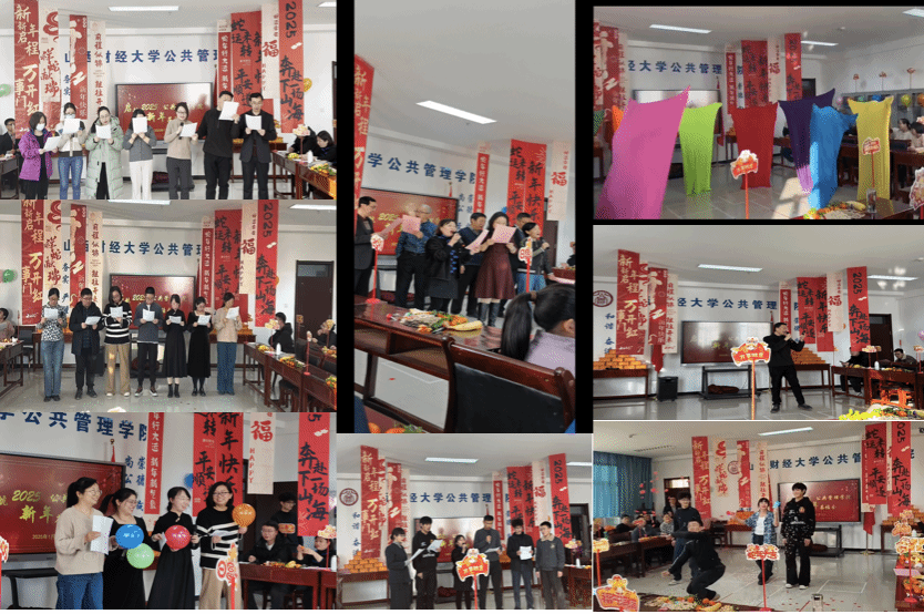 在联欢会的节目表演中,师生们展现了他们的新颖创意、精神活力、家国情怀和美好希冀。行政管理系的老师们表演的舞蹈《爱如火》从着装、音乐、色彩、舞姿等方面都极具创意,体现了先锋的艺术气息,令人印象深刻;段宇波副院长和宣星宇、靳永广、刘汉超老师带来的朗诵《我爱科研》用幽默诙谐的方式表达了对科研工作的体会与热爱,引来阵阵笑声。许钰婉、许晶晶、黄维峰、王乾呈4名学生带来的街舞表演《东西合璧》极具感染力,让在场的老师们都感受到了扑面而来的青春气息;吴喜慧、向燕芸、袁媛、宋一芝4位青年教师演唱了歌曲《上春山》,她们活力满满、开心喜悦的表演状态触动到了在场的每个人;赵波老师独唱的《麻雀》蕴含的乐观顽强的精神斗志,给人鼓舞和力量。王琼、张凯老师与学生代表演唱的《我和我的祖国》,土地资源管理系教师集体朗诵的《祖国是什么》体现了他们对祖国深深的眷恋,其中的声音和词句都令人动容;劳动与社会保障系教师集体朗诵的《共筑社会保障之光》表达了对公平正义社会保障体系的追求,这份大爱情怀令人感佩。学院领导班子最后演唱的《在希望的田野上》寄托了对秀人网