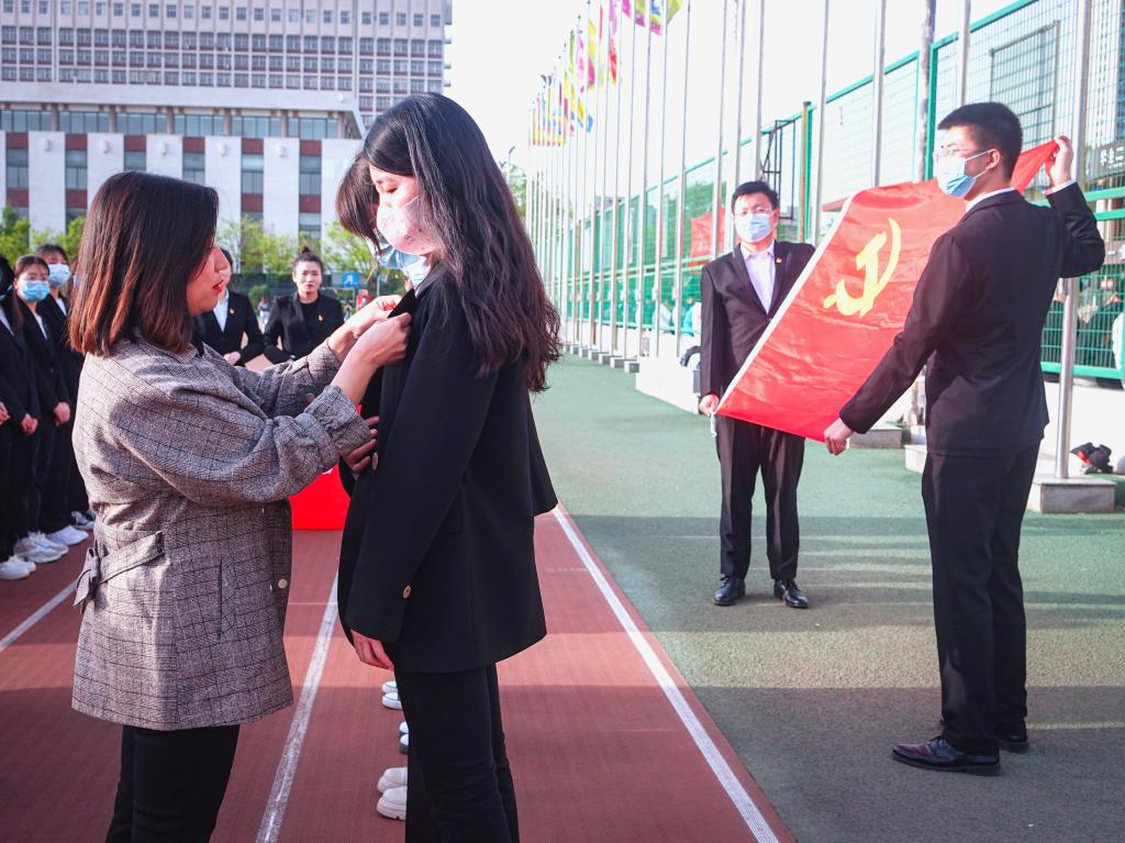 “我志愿加入中国共产党,拥护党的纲领,遵守党的章程……”,学院团委书记王琼带领在场党员重温入党誓词,大家紧握右拳,真挚地表达了对党的忠诚热爱和为共产主义奋斗终身的决心。随后,王老师为新发展党员佩戴党员徽章,并寄语:新的身份新的起点,不仅要组织上入党,更要思想和行动上入党,要时刻保持党员的先进性,坚持学习文化知识,不断提升理论素养,主动作为,乐于奉献,争做祖国合格的建设者和接班人。