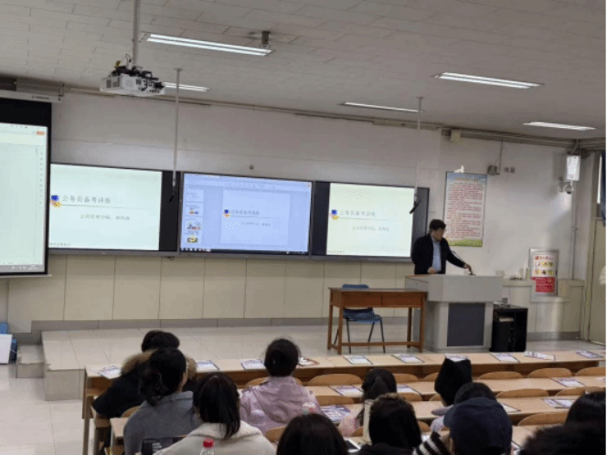 坞城校区阶梯教室进行,共分为行政能力测试与申论两场。考场全程高度还原公考实况,从时间管控到作答规范均严格对标。此举不仅营造了真实的应试氛围,更使参赛者对考试题型与节奏形成了清晰认知。